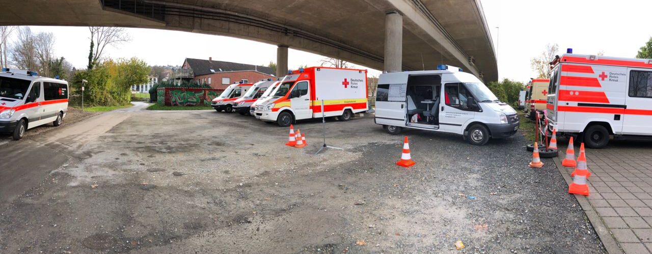 Zu den örtlichen DRK-Einsatzkräften und den übrigen Einsatzkräften aus dem Kreis kamen auch zahlreiche weitere Patiententransportzüge 10 (PTZ 10) aus dem gesamten Land NRW, um bei dem Transport der Patienten und Betroffenen zu unterstützen.
