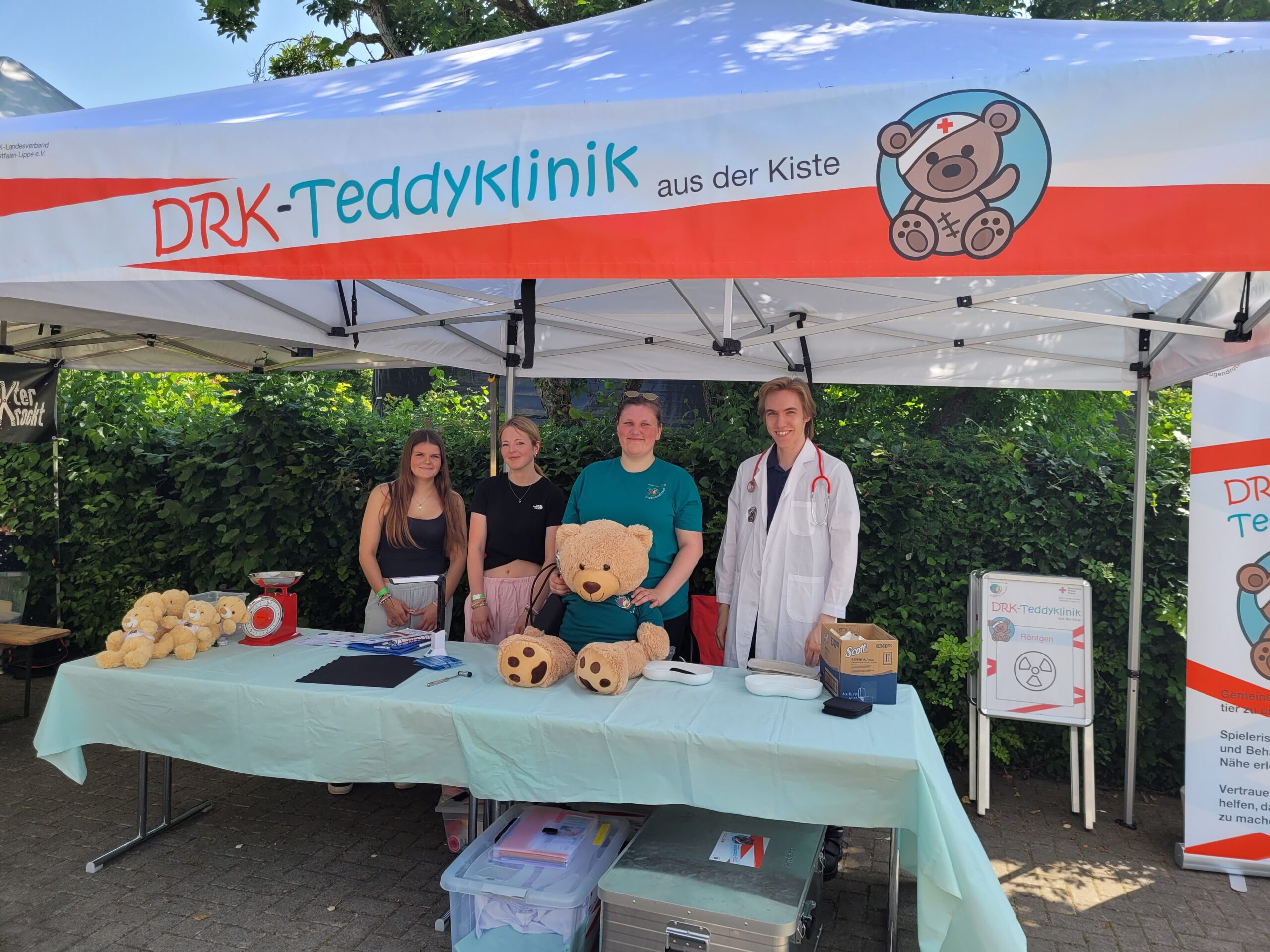 Währen die Feuerwehr viele verschiedene Mitmachaktionen anbot, stellte unser Jugendrotkreuz wieder das Wundenschminken sowie erstmalig die „Teddi-Klinik“, welche von einer JRK-Helferin aus Löhne sowie dem stv. Kreisjugendrotkreuzleiter des Kreisverband Herford-Land unterstützt wurde. Hier konnten die Kinder spielerisch den Durchlauf einer Arztpraxis kennenlernen und selbst an einem Kuscheltier Behandlungen vornehmen.
