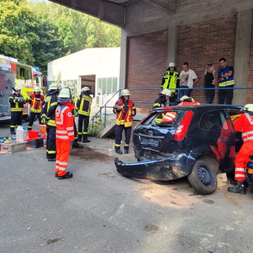 Höhepunkt des Tages war eine gemeinsame Übung der Jugendfeuerwehr zusammen mit unserem Krankentransportwagen, bei der die Rettung einer verletzten Person aus einem verunfallten Fahrzeug geübt wurde.