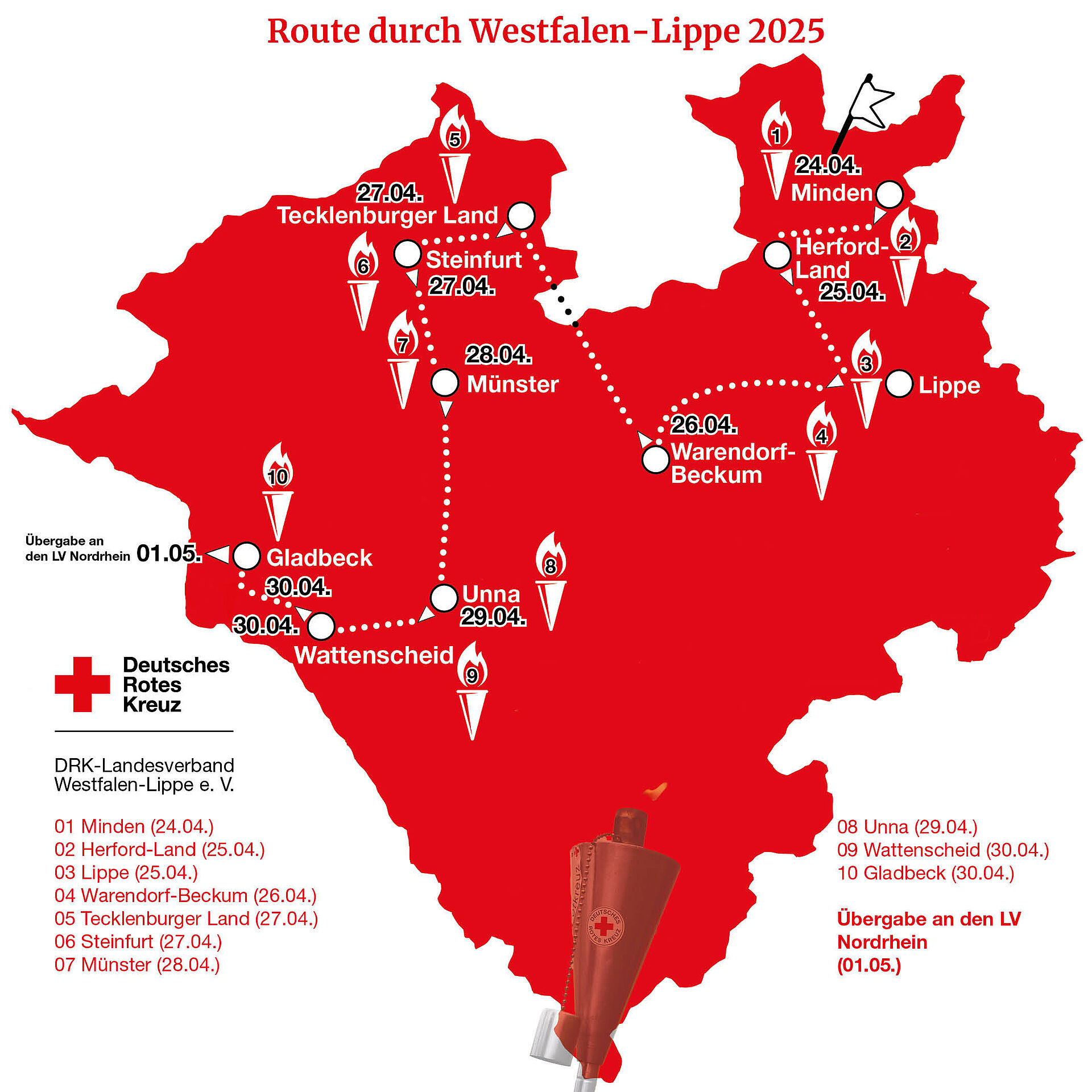 Am 15. Februar 2025 begann der Fackellauf nach Solferino im DRK-Landesverband Schleswig-Holstein. Seither reist die Fackel von dort aus durch verschiedene Bundesländer bis sie am 24. April 2025 zu uns nach Westfalen-Lippe kommt.