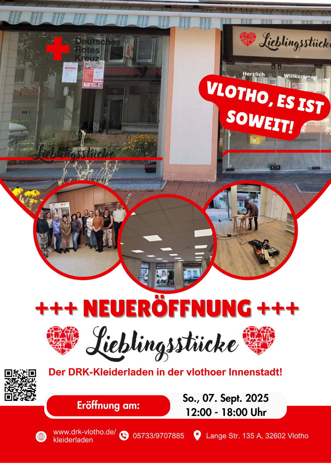 Nach langer Vorbereitungszeit konnte am Sonntag, den 07. September 2025 endlich die Eröffnung unseres neuen DRK-Kleiderladens „Lieblingsstücke“ in der Langen Straße 135 A in der vlothoer Innenstadt gefeiert werden.